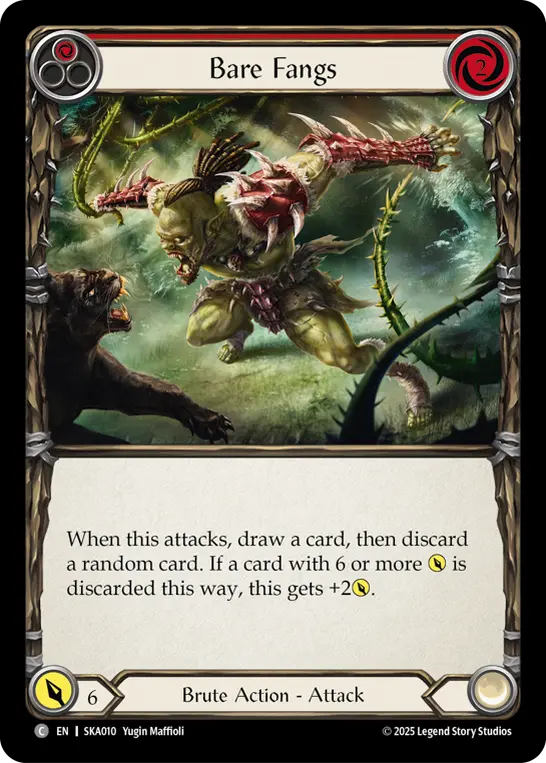 When this attacks, draw a card then discard a random card. If a card with 6 or more {p} is discarded this way, Bare Fangs gains +2{p}.