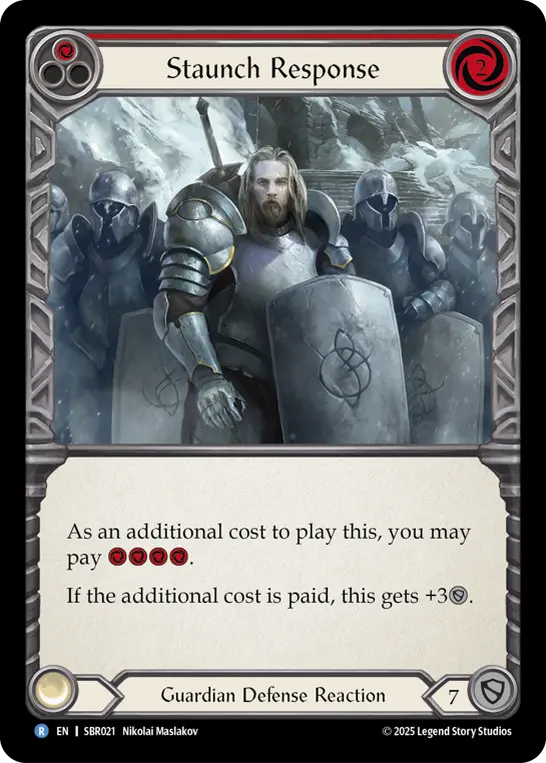 As an additional cost to play Staunch Response you may pay {r}{r}{r}{r}. If you do, Staunch Response gains +3{d}.