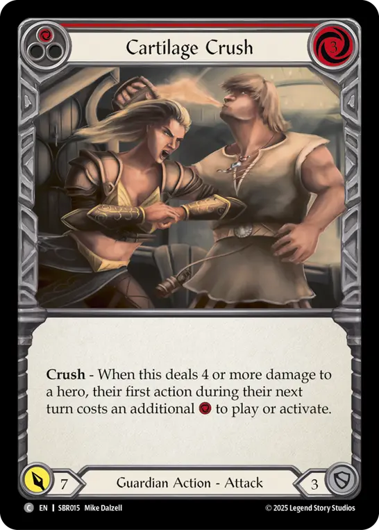 Crush - When this deals 4 or more damage to a hero, their first action during their next turn costs an additional {r} to play or activate.