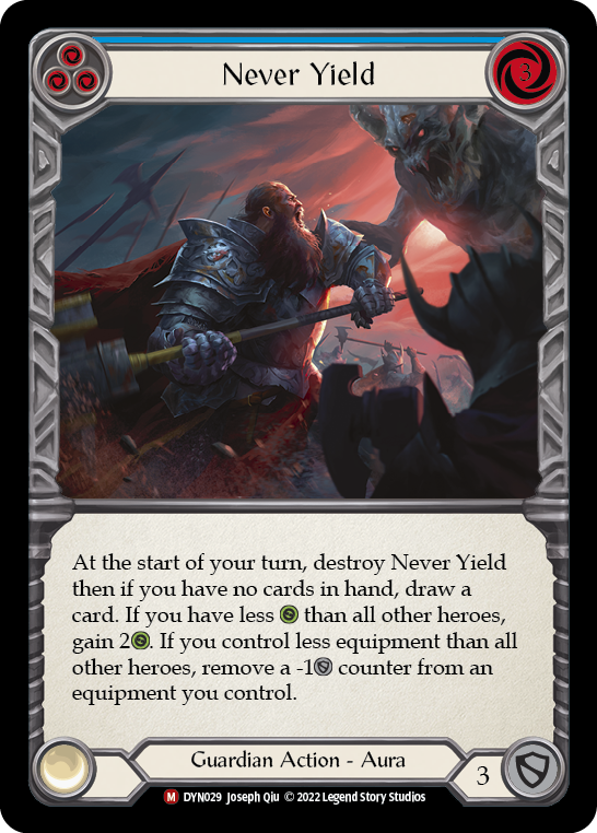 At the start of your turn, destroy Never Yield then if you have no cards in hand, draw a card. If you have less {h} than all other heroes, gain 2{h}. If you control less equipment than all other heroes, remove a -1{d} counter from an equipment you control.