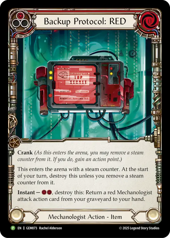 Instant - {r}{r}, destroy this: Return a red Mechanologist attack action card from your graveyard to your hand.