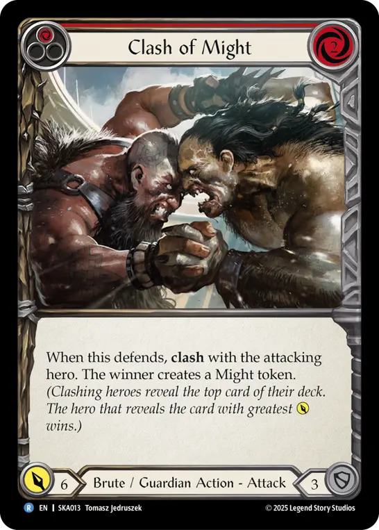 When this defends, clash with the attacking hero. The winner creates a Might token.