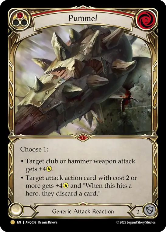 - Target attack action with cost 2 or greater gains +4{p} and "If this hits a hero, they discard a card."