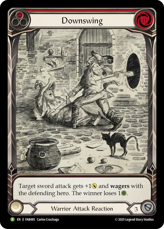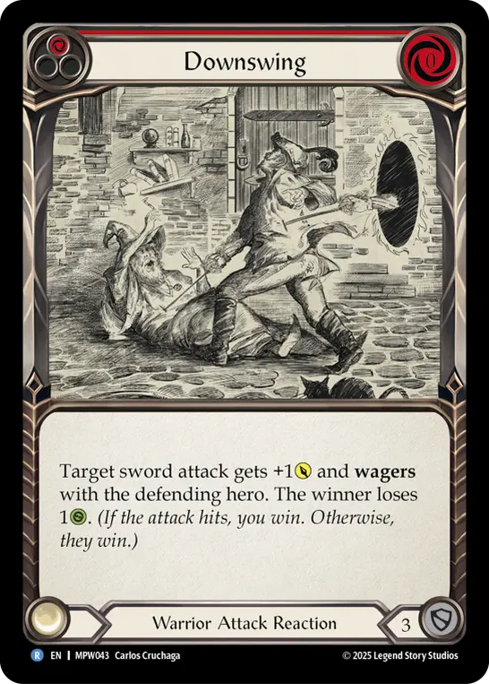 Target sword attack gets +1{p} and wagers with the defending hero. The winner loses 1{h}.